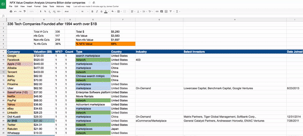 – We know the list of 336 is incomplete and many numbers debatable. We debated them ourselves. This was an exercise to get a solid estimate, not to be scientific or exhaustive. Given the large number of companies (336), and having played with many scenarios, we feel the conclusion about the power of network effects stands, and the 68% estimate is solid.When we first started building this spreadsheet in 2015, it first showed that 62% of value came from network effects businesses. That number has only increased since then.