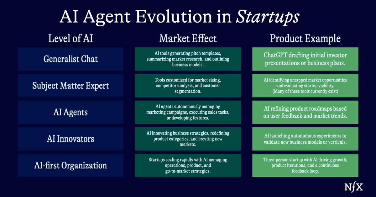 Example of how the evolution of AI agents will play out for startups. As you build your product, be aware that you can’t be stuck at one evolutionary level for long –– competition is moving toward level 5.