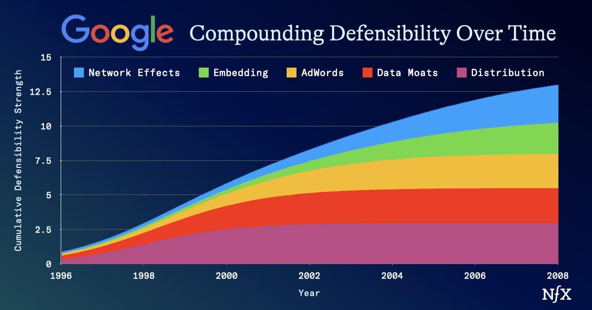 Let’s take the birth of search for example. Google’s journey perfectly illustrates how defensibilities should be deployed sequentially.