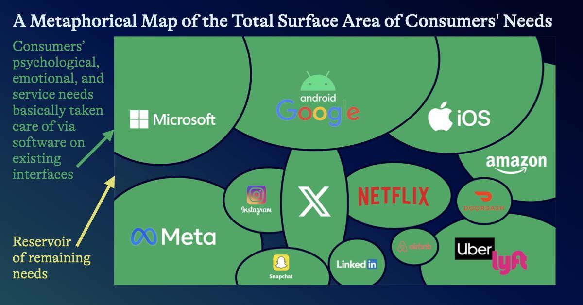 2. For what can be done on these interfaces, the psychological and emotional needs of consumers are largely taken care of. The number of things to do through those old interfaces aren’t infinite. Founders early in the technology window grabbed the low hanging fruit. The reservoir of unmet needs of consumers is now small enough that there isn’t enough potential energy to create a giant movement. This diagram illustrates it.