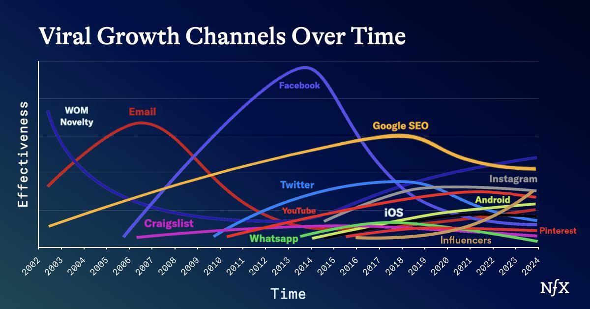 Here is a chart I published in 2021 in this essay talking about the different types of channels for free user growth. It illustrates how the incumbents have put toll booths on all the consumer growth channels to their own benefit and closed the window for startups.