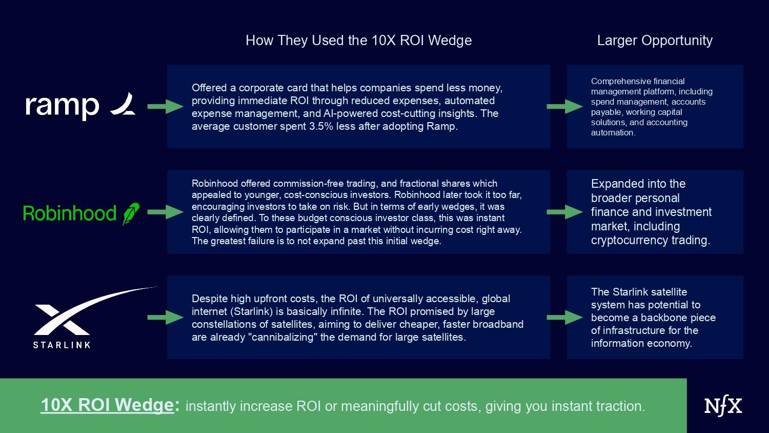 The “10X ROI wedge” works if you can instantly increase ROI or meaningfully cut costs. That’s going to give you instant traction.