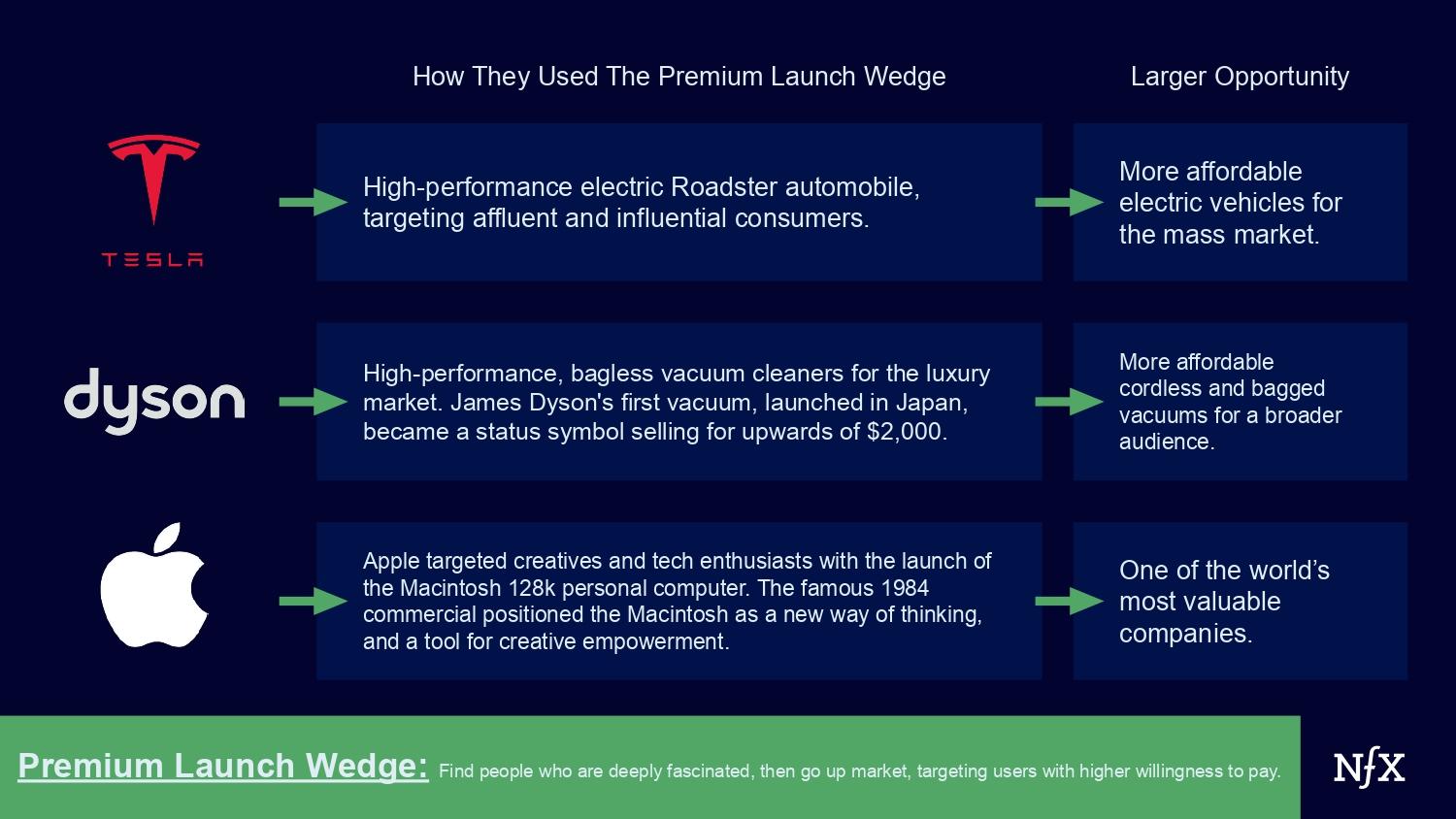 This wedge is useful because it allows you to build in an area of reduced competitive pressure – there are likely to be few people creating expensive items for a small market. A high-end launch may provide more up-front revenue for you to build scale capacity, and you will learn the necessary operational procedures needed to serve the larger market.