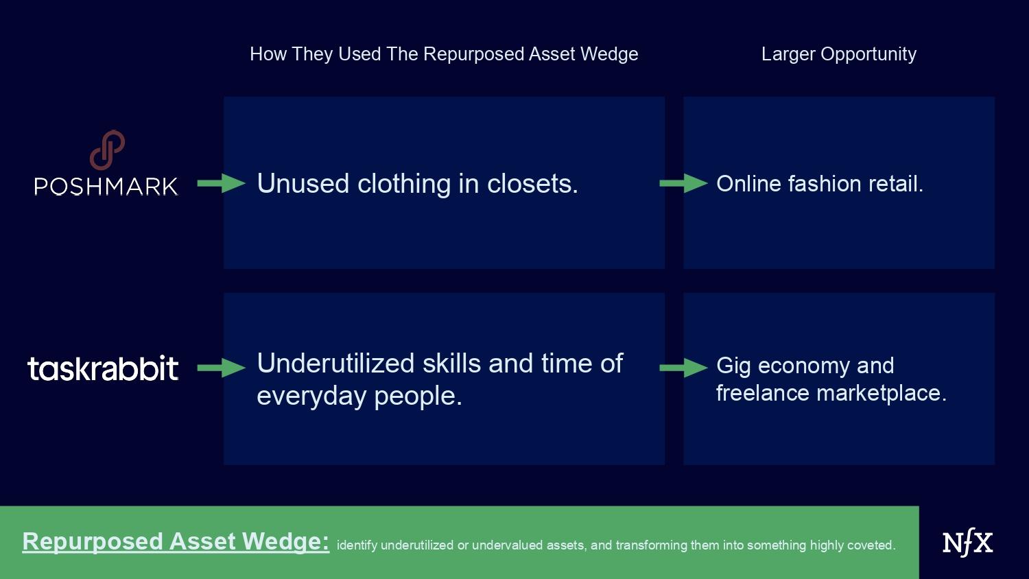 Second, reposition that asset into something that is already valuable: a side hustle, extra space in a kitchen or hotel, etc. That’s how you use this wedge to eventually enter the larger, more competitive market.