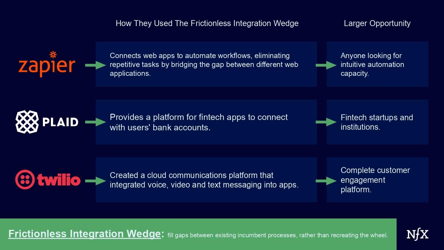 This wedge is a product that aims to fill gaps between existing incumbent processes, rather than recreating the wheel. By filling gaps between platforms, you can gain market share, and set the stage for building your own tools over time.