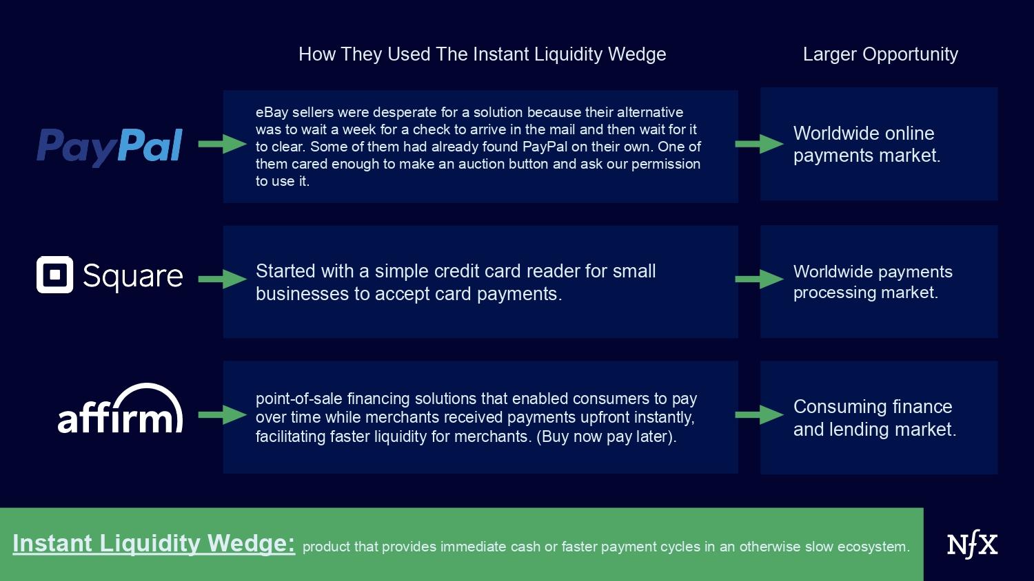 The “instant liquidity wedge” is a product that provides immediate cash or faster payment cycles in an otherwise slow ecosystem.