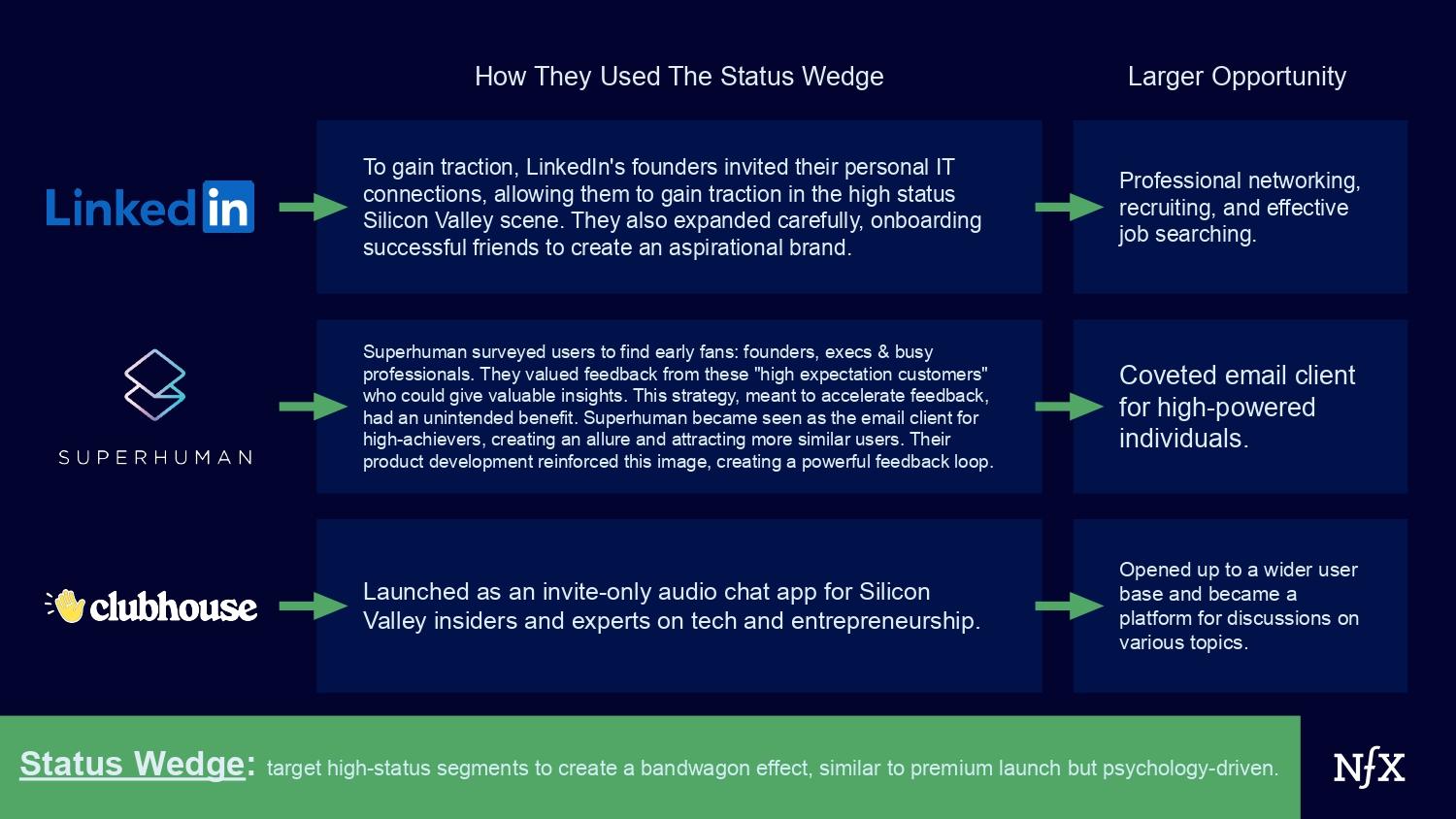 If you can use this wedge effectively, it often works as a double litmus test. First, if you are able to provide a uniquely valuable service to high status customers, that says a lot about your ability to adapt, intake feedback, and improve. High status customers are connoisseurs with deep market knowledge: they live and breathe this, and if you can appeal to them, you’re likely on the right track.