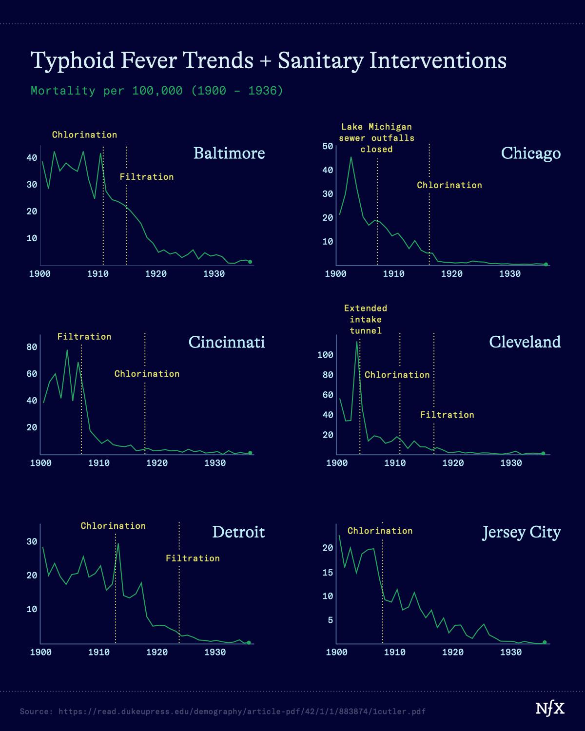Soon, we saw the development of water treatment technologies like sand filtration, mechanical water filtration, and water chlorination. Those technologies reduced deaths even more. By some estimates, clean water was responsible for nearly half the mortality reduction seen in major cities in the late 19th and early 20th century.