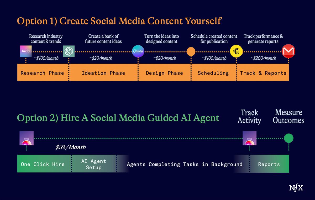 NFX-backed Enso was one of the first companies to recognize this. Enso is a platform developing industry-specific Guided AI Agents capable of executing full workflows at low cost, like creating marketing campaigns, doing sales outreach, or executing HR tasks. These AI agents are “hireable” as virtual freelancers, who focus on completing these complex goals.