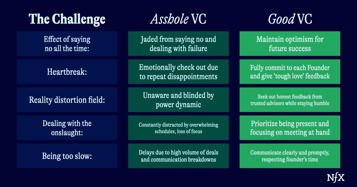 Each of us had experiences with amazing investors…and some real asshole investors. Our biggest fear is waking up one day and realizing that somehow, we became the thing we hated the most. You know the type: late for meetings, always looking at their phone instead of listening, ghosting founders, stressing founders out for no reason, giving unthoughtful, obvious advice.