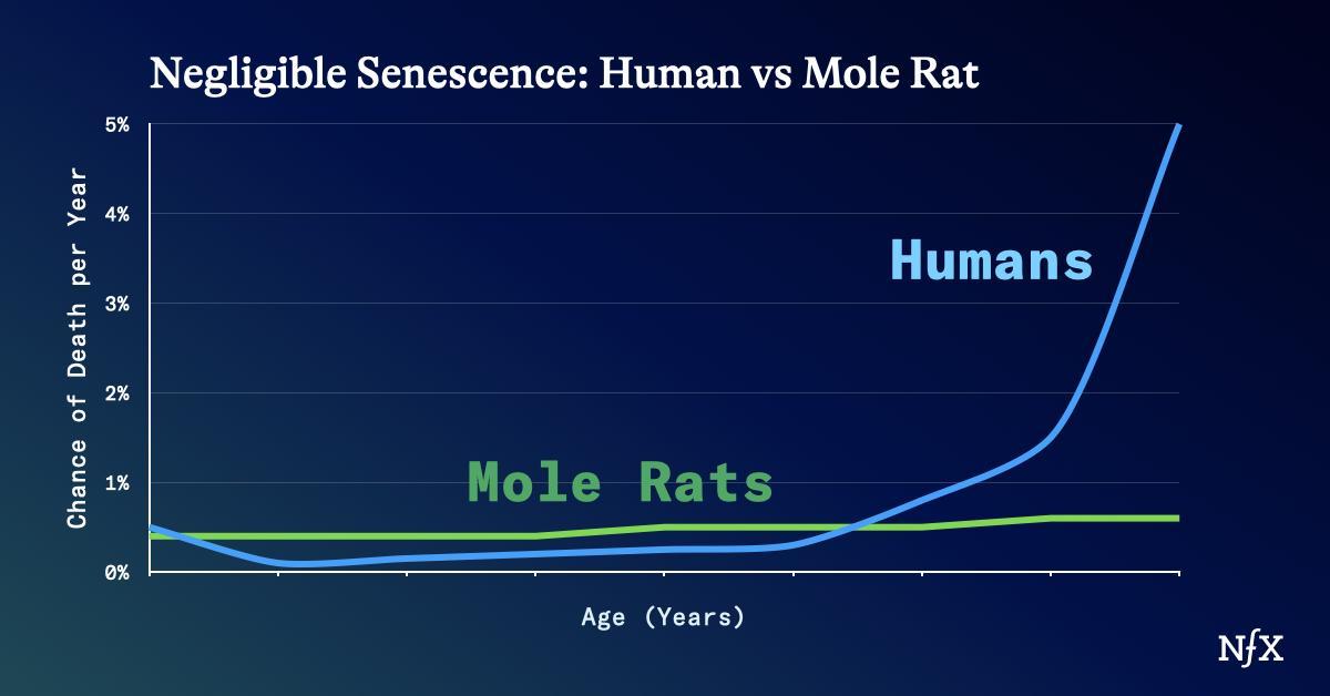 Naked mole rats, for example, have a low and constant risk of death throughout life. Their biological risk of dying per year of life looks something like this: