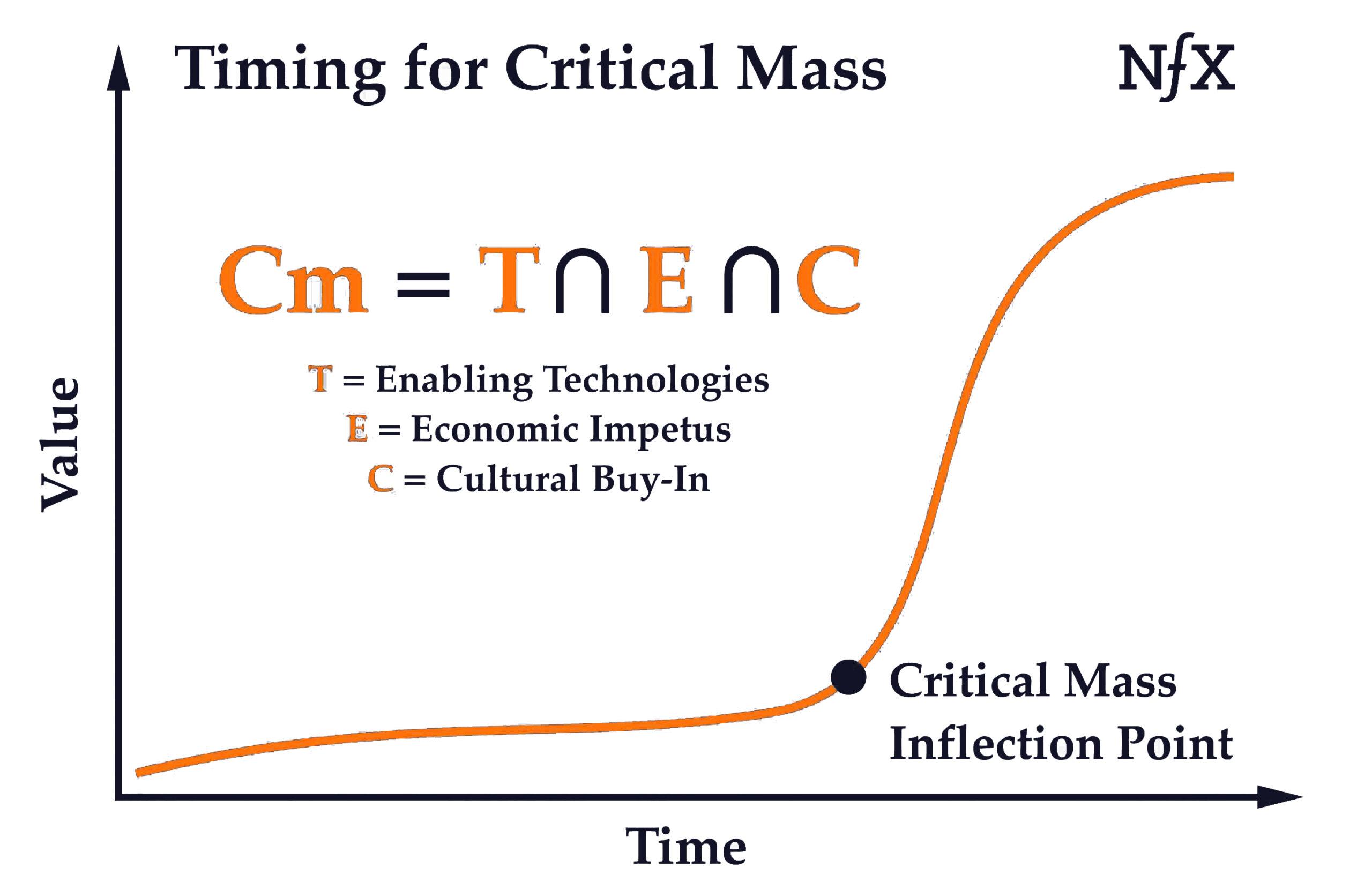 To help better understand startup timing, we’ve developed a framework we call the Critical Mass Theory of Startups. It’s the tipping point for when a product or market goes under rapid transformation, seemingly overnight. A critical mass point for a startup opportunity arrives when there’s a minimum threshold of three preconditions:
