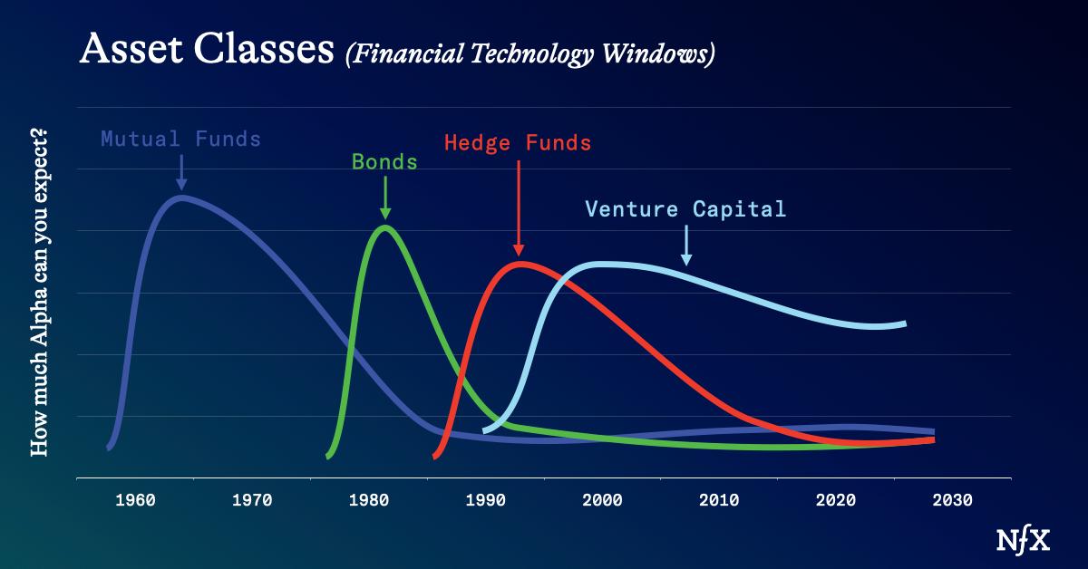 The technology window pattern also affects what we think of as “asset classes.” Assets classes are not immutable. Technology will shift and suddenly bring these asset classes into being, and then the “alpha” of these asset classes follows the same trajectory.