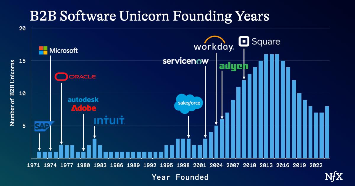 Look below. We have seen three underlying tech windows for B2B software: on premise, SaaS and AI. We are eight years into the third tech window, AI. There is still an open window to create big companies using AI as a wedge.