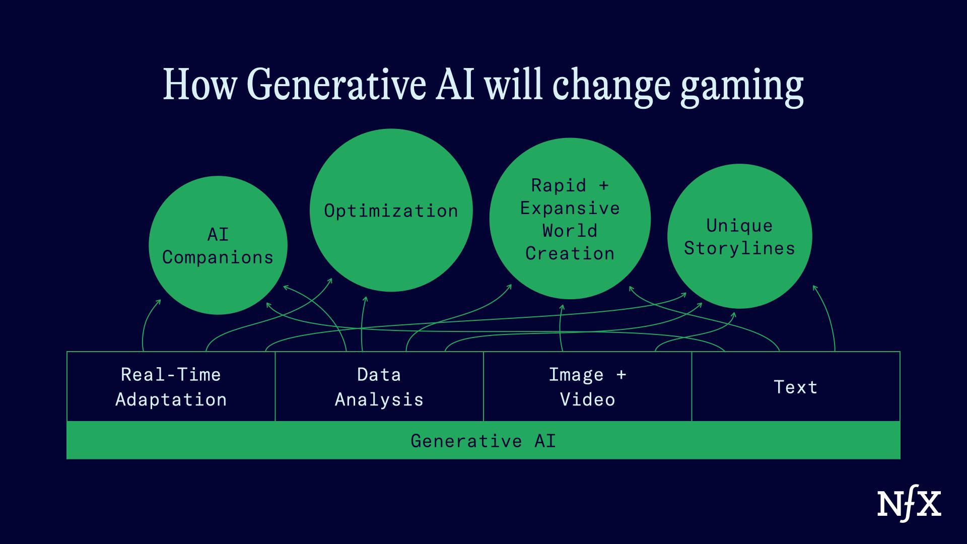 Games companies are poised to become the biggest early adopters at scale of generative AI. We are already seeing the impact generative AI can have on the games themselves. AI has vastly decreased the costs associated with creation. When creation cost (time, monetary, ideation) goes down, innovation goes up. That decrease in cost will make games more interesting in four ways: