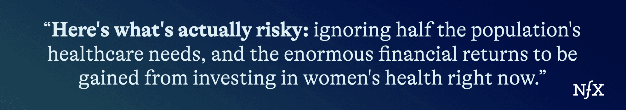 Here’s what’s actually risky: ignoring half the population’s healthcare needs, and the enormous financial returns to be gained from investing in women’s health right now. The numbers speak for themselves: only about 2% of VC investment is currently directed toward female-specific conditions.